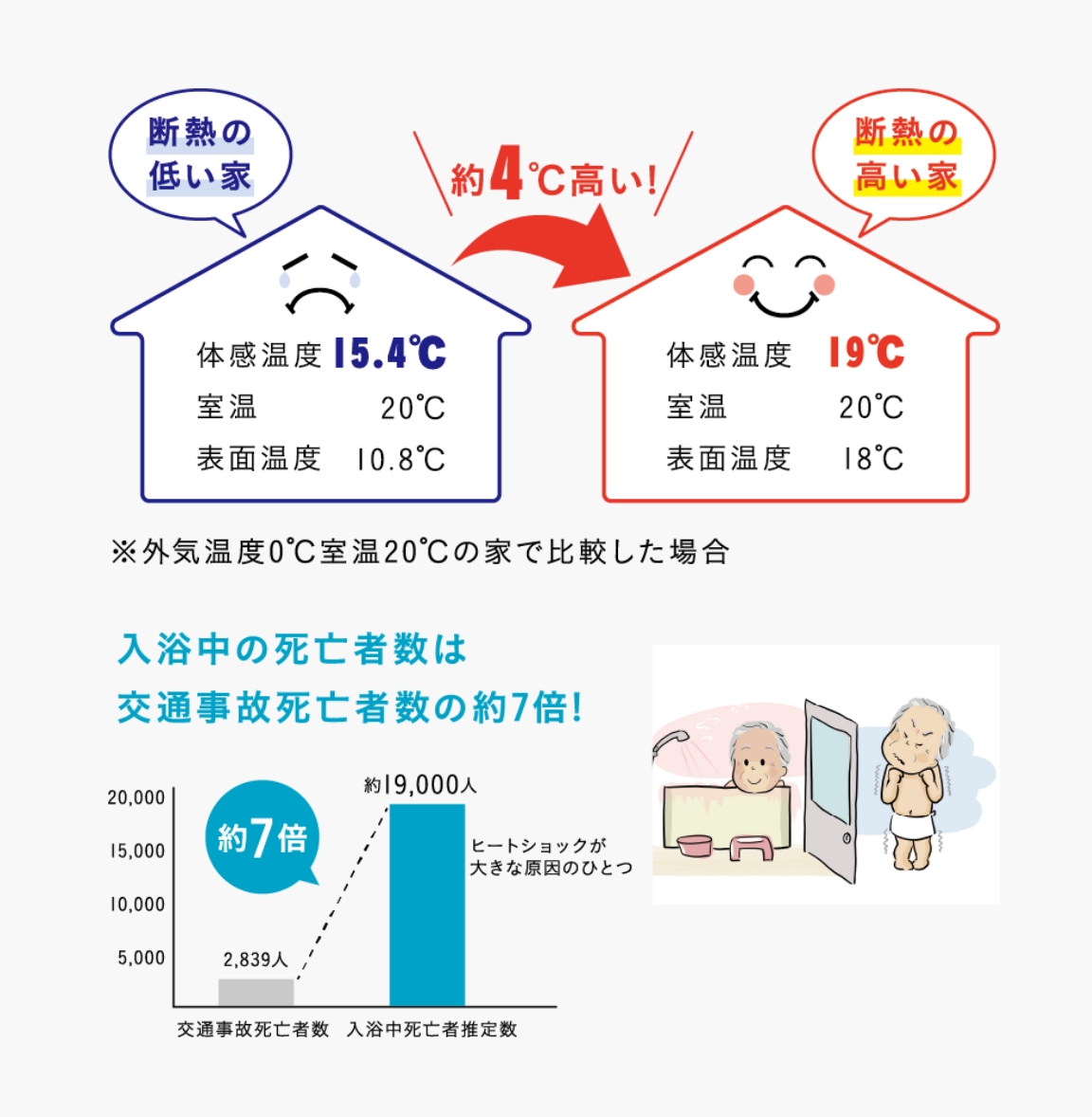 「ヒートショック」と呼ばれる家の中の急激な温度差により、亡くなる人の数は年間19,000人(交通事故による死者数の約7倍)にものぼります。