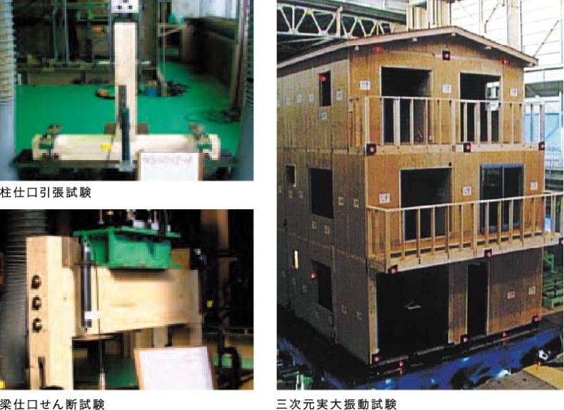 耐久性は、1995年の阪神淡路大震災を再現した三次元大振動試験によって検証されています(2004年12月7日於:独立行政法人土木研究所)。また、性能評価機関に準じた試験内容(「在来軸組工法住宅の許容応力度設計」公益財団法人日本住宅・木材技センター企画編集)で各接合部の耐力を検証。高い強度を実証しています。