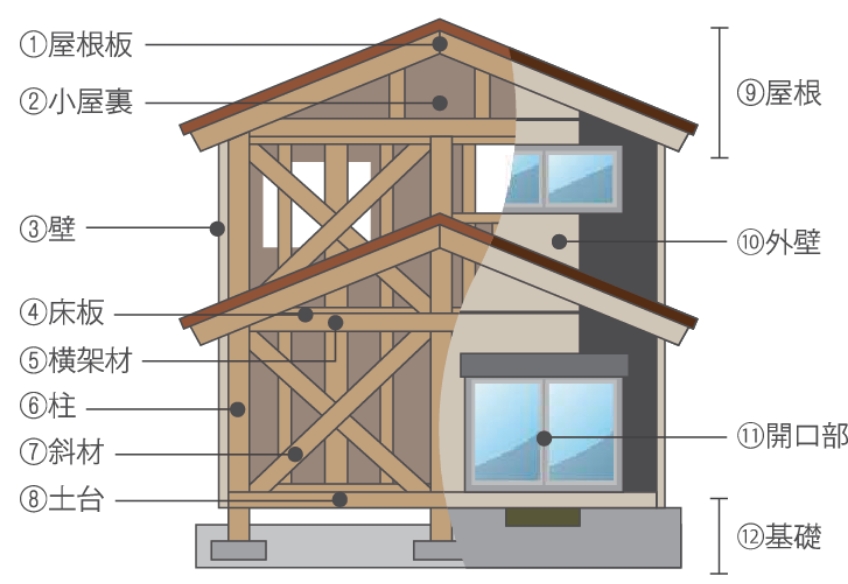 基礎/外壁/屋根/バルコニー/外部窓/内装/建具/設備/柱・梁/小屋裏/軒裏/床組