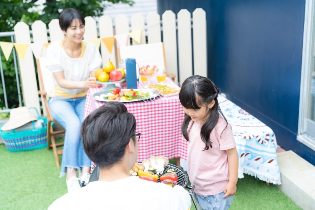 おすすめは、約2メートル四方のタイルテラスやタイルデッキ。芝生のお庭も、一部にタイルスペースを用意すると良いでしょう。タイルは熱や汚れに強く、掃除も簡単。バーベキュー以外にも、テーブルを出してカフェスペースにしたり、お子さまのプール遊びに使ったりと、多目的に活用できます。